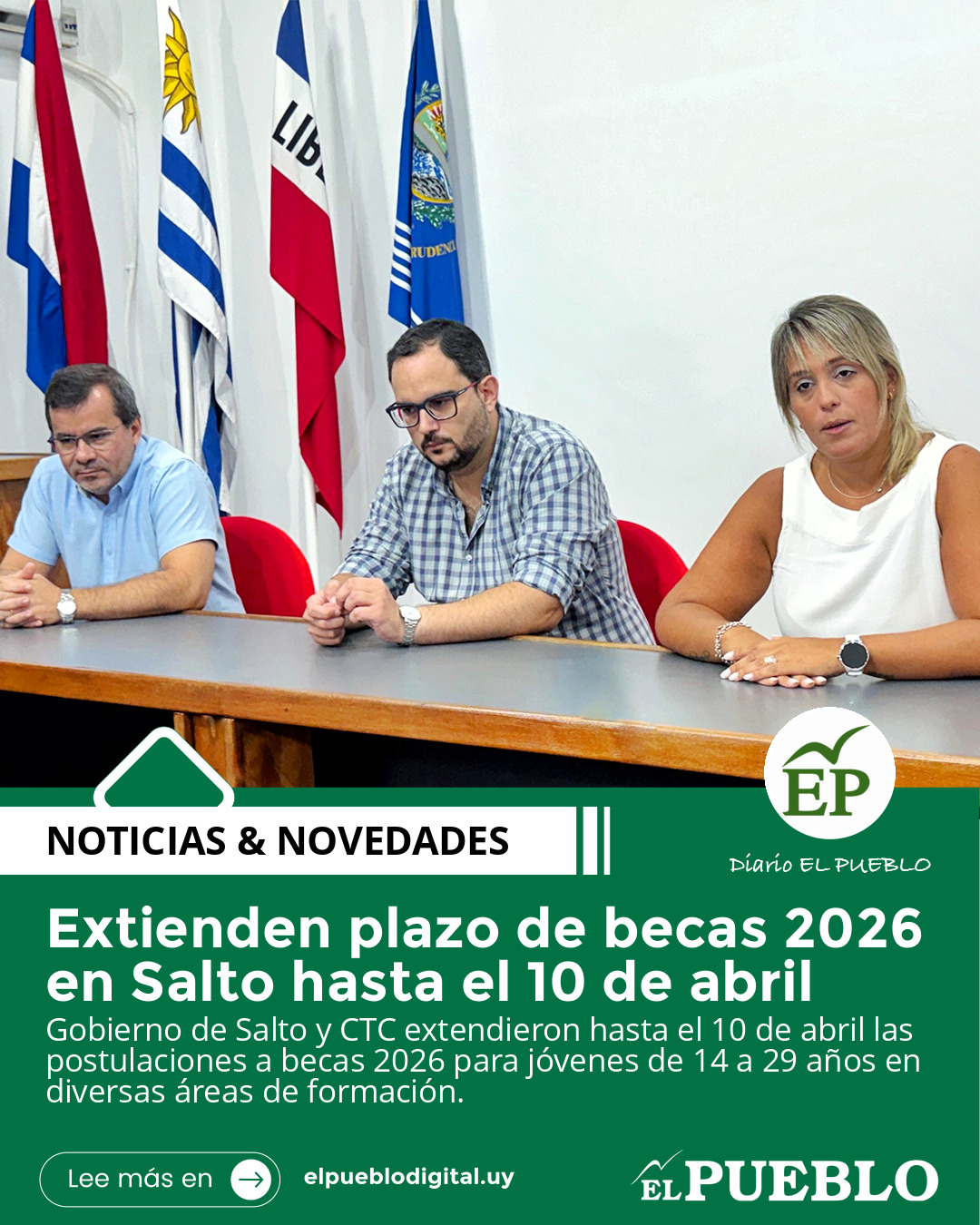 El Gobierno de Salto, a través de la Oficina de la Juventud, junto al Instituto CTC Salto, resolvió extender el plazo de postulaciones al Programa de Becas 2026. Ahora, los interesados podrán inscribirse hasta el viernes 10 de abril a las 16 horas.