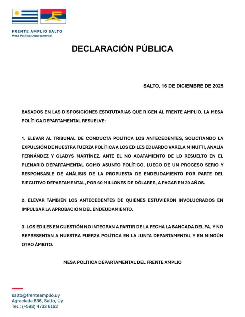 La noche del martes 16 de diciembre quedará marcada en la historia política reciente del departamento. La Mesa Política Departamental del Frente Amplio (FA) resolvió, con firmeza, solicitar la expulsión de sus filas a tres ediles.