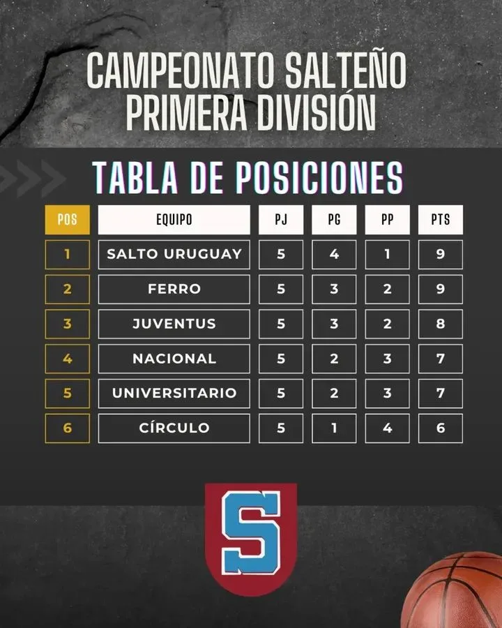 El Campeonato Salteño de Básquetbol que va avanzando. La tabla de posiciones que se va componiendo. Los que más ganaron, los que puntean. Ayer jueves se enfrentaban Juventus vs Salto Uruguay y Nacional vs Círculo Sportivo.