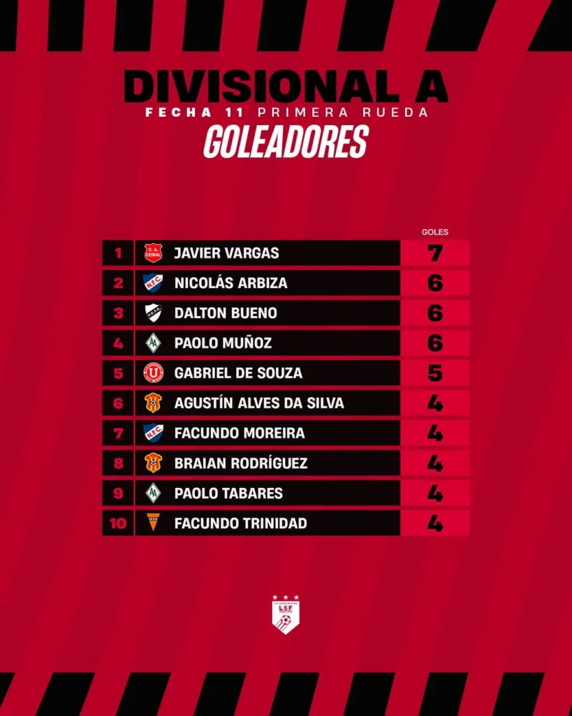Pero otra tabla es la que surge paralela y se trata de quienes componen los puestos de vanguardia a la hora del gol. El máximo registro a la cuenta de Javier «Toti» Vargas, el delantero oriundo de Cardal (Florida), que este año se integró a Ceibal.