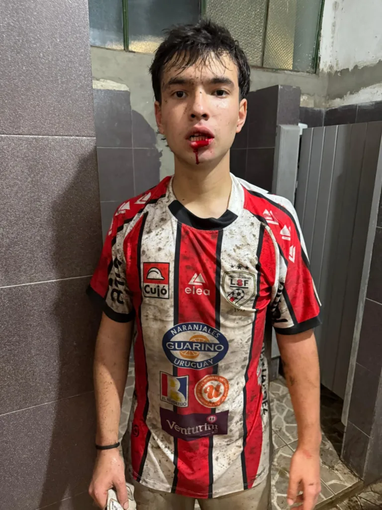 El labio inferior de Matheo Cresseri sangrando, como consecuencia de los hechos de violencia que se generaron en la zona de vestuario del Estadio Matías González de Artigas.