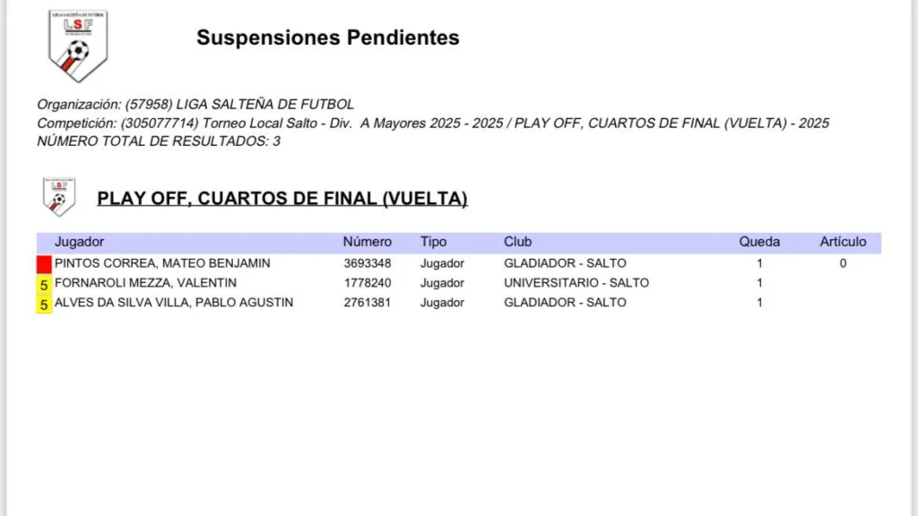 Mientras el paso de los días se produce, diciembre se viene y los suspensos no faltan. Al decir de un delegado: «este es el fútbol de a los trancazos». Otro paréntesis. Y es del caso transcribir desde EL PUEBLO, esta información que certifica de hecho los casos de Valentín Fornaroli de Universitario y Agustín Alvez Da Silva de Gladiador.