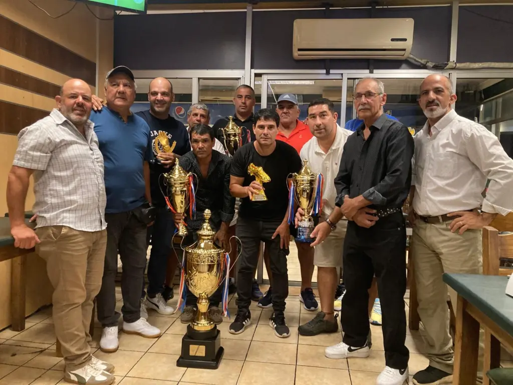 La lente de Massarino Fotos para EL PUEBLO, y una captación que es síntesis de lo vivido y disfrutado el miércoles a la noche, cuando la Liga de Fútbol Súper Sénior, procedió a adjudicar los trofeos al cabo de la nueva temporada, que implicó la consagración de Unión Don Atilio. Las copas que ganaron en lo colectivo, pero en el plano individual las distinciones que no faltaron, para el golero menos vencido y el máximo goleador.