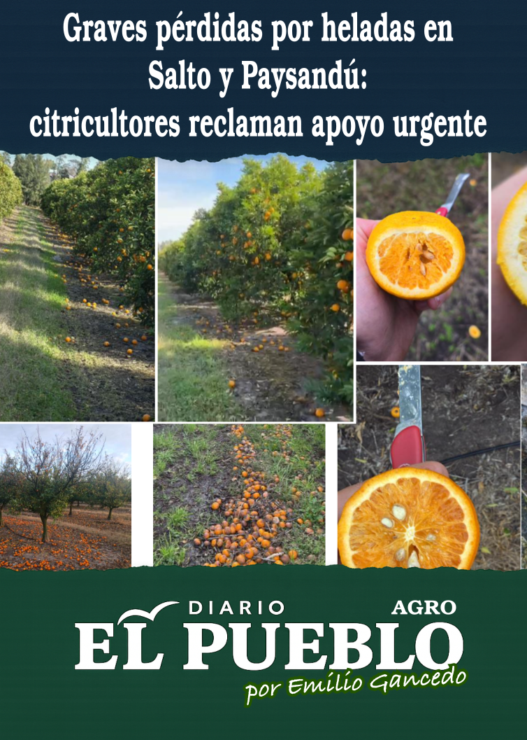 Un mes después de las intensas heladas registradas los días 1 y 2 de julio en el norte del país, productores citrícolas de Salto y Paysandú enfrentan una situación crítica. Según un informe elaborado por la Sociedad Fomento Rural de Salto, los daños en los cultivos de mandarinas, naranjas, limones y pomelos alcanzan niveles dramáticos, con chacras que perdieron entre el 70 y el 90% de su producción.