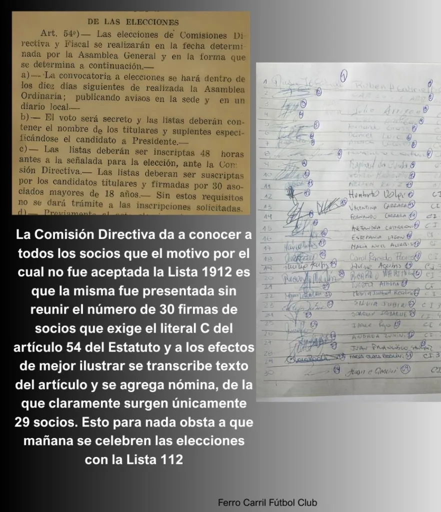 Fue a media tarde del pasado viernes, cuando desde la Comisión Directiva de Ferro Carril Fútbol Club se comunicó a la lista opositora 1912, que esta «no fue aceptada porque fue presentada sin reunir el número de 30 firmas de socios que exige el literal del artículo 54 del estatuto….» Por lo tanto, a partir de ese pronunciamiento descrito, el acto eleccionario de hoy en la entidad albinegra, implica que para el presidente en ejercicio, Dr César Signorelli y quienes lo secundan en la lista que responde al oficialismo, «es como correr en una carrera ya ganada de antemano». En el literal C, la conclusión es que «sin estos requisitos NO SE DARÁ TRÁMITE a las inscripciones solicitadas».