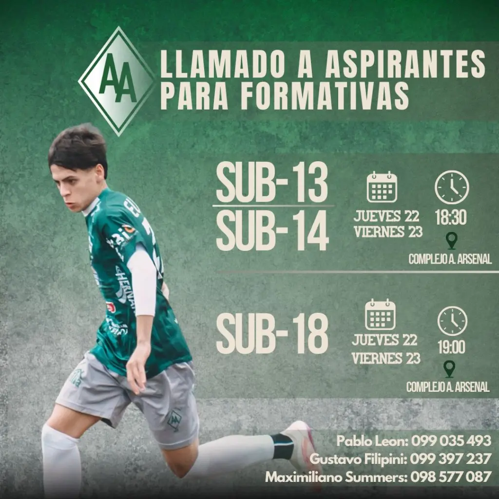No solo rige el fútbol de Primera División. Después de todo, las divisiones juveniles son parte activa en los clubes. Atlético Arsenal no es la excepción y en función de ello, el llamado a aspirantes para las categorías formativas. Jueves y viernes de esta semana son los días pactados. Desde el presidente de Arsenal, Juan José Guarino, esta síntesis informativa que bien vale la pena tener en cuenta, con tres DT en el horizonte de la nueva tentativa: Pablo León, Gustavo Miguel Filippini y Mario Maximiliaro Summers. La opción que genera Arsenal.