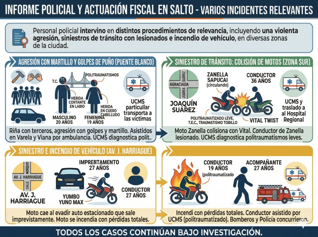 En primera instancia, se presentó en dependencias policiales un usuario informando que, en la intersección de calles José Pedro Varela y Avenida Gobernador de Viana, había una persona caída. Una vez en el lugar, se entrevistó a un joven de 20 años y a una joven de 19 años, quienes manifestaron que momentos antes, en el Puente Blanco ubicado en Avenida Carlos Reyles, habían mantenido una riña con terceros, siendo agredidos con golpes de puño y un martillo. Ambos fueron trasladados por un particular hasta el lugar donde fueron asistidos.