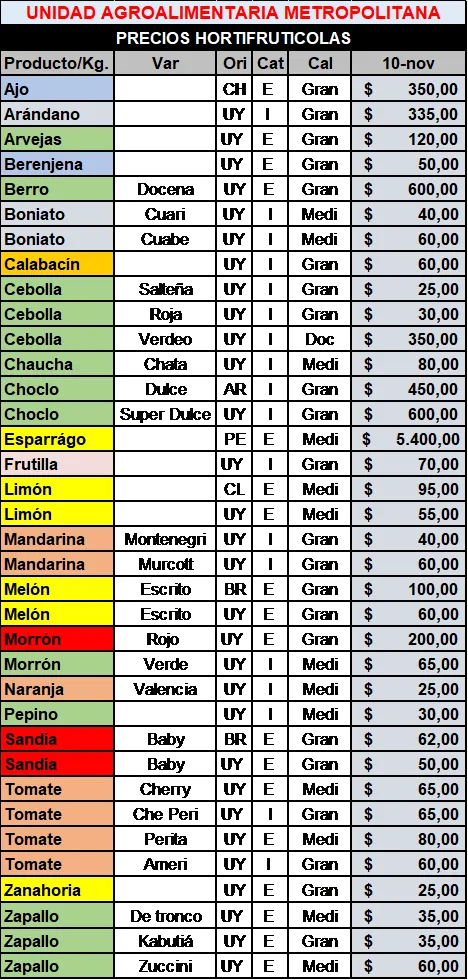 Mercado. Ahora, informamos sobre la comercialización, desde los informes de Precios Mayoristas de la Unidad Agroalimentaria Metropolitana, U.A.M., a saber: Lunes, 10 de Noviembre del 2025: La jornada comercio transcurrió ágil en un escenario de buena concurrencia de público comprador. Según referentes, el inicio del mes y las buenas condiciones del fin de semana fueron los principales determinantes de la mejora en la colocación. Con respecto al último relevamiento de precios, se observaron aumentos en los precios de zapallito, frutilla, espinaca, puerro, boniato Arapey/Cuarí, zapallo Kabutiá y pepino de calidad superior. Por otro lado, se registraron descensos en los valores de: cebolla temprana y Roja y tomate oblongo.