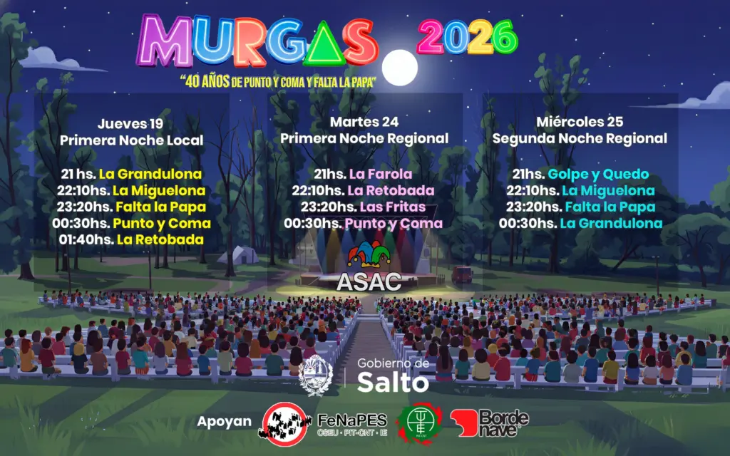 La invitación queda abierta para toda la comunidad: acompañar, apoyar y disfrutar. Porque el carnaval no se construye solo desde el escenario, sino también desde el público que se acerca, que escucha, que se emociona y que sostiene esta tradición año tras año. Esta noche será una muestra clara de que las murgas están más vivas que nunca y que el carnaval de Salto sigue escribiendo su historia con voz propia, alegría y convicción popular.