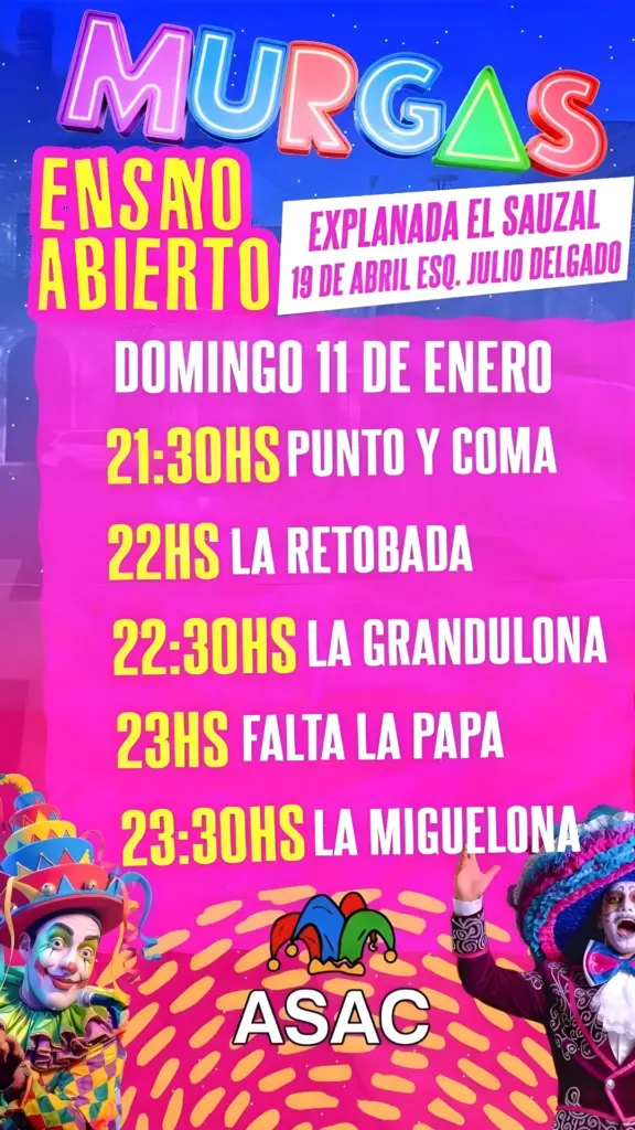 Este año contamos con 5 murgas: La Retobada, La Grandulona, La Miguelona y dos murgas legendarias que vuelven al carnaval, como lo son Punto y Coma y Falta la Papa, cumpliendo 40 años.