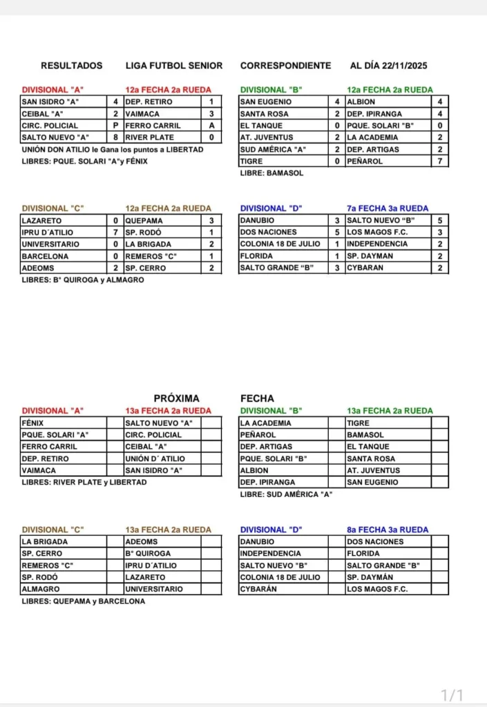 Mientras Unión Don Atilio ganó los puntos ante Libertad, lo de Salto Nuevo resultó demoledor en la nueva fecha de la Liga de Fútbol Sénior, llegando a ocho goles en su partido ante River Plate. En tanto Círculo Policial ganó sin jugar por la ausencia de Ferro Carril. Los partidos que no faltaron en las cuatro divisionales y la fecha que vendrá. Un todo para tener en cuenta.