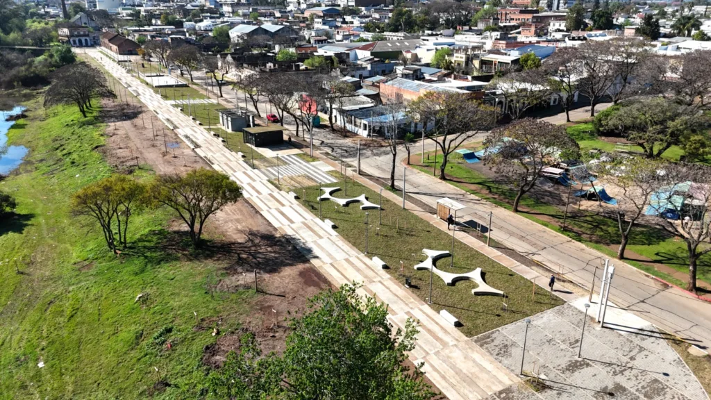 El diseño del Parque Sauzal apuesta a la sostenibilidad, incorporando especies de forestación nativa y materiales reutilizables, lo que garantiza una infraestructura más resistente a las crecidas del río Uruguay.