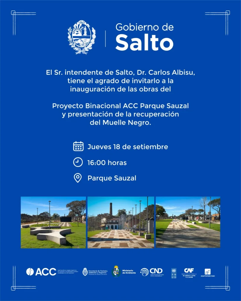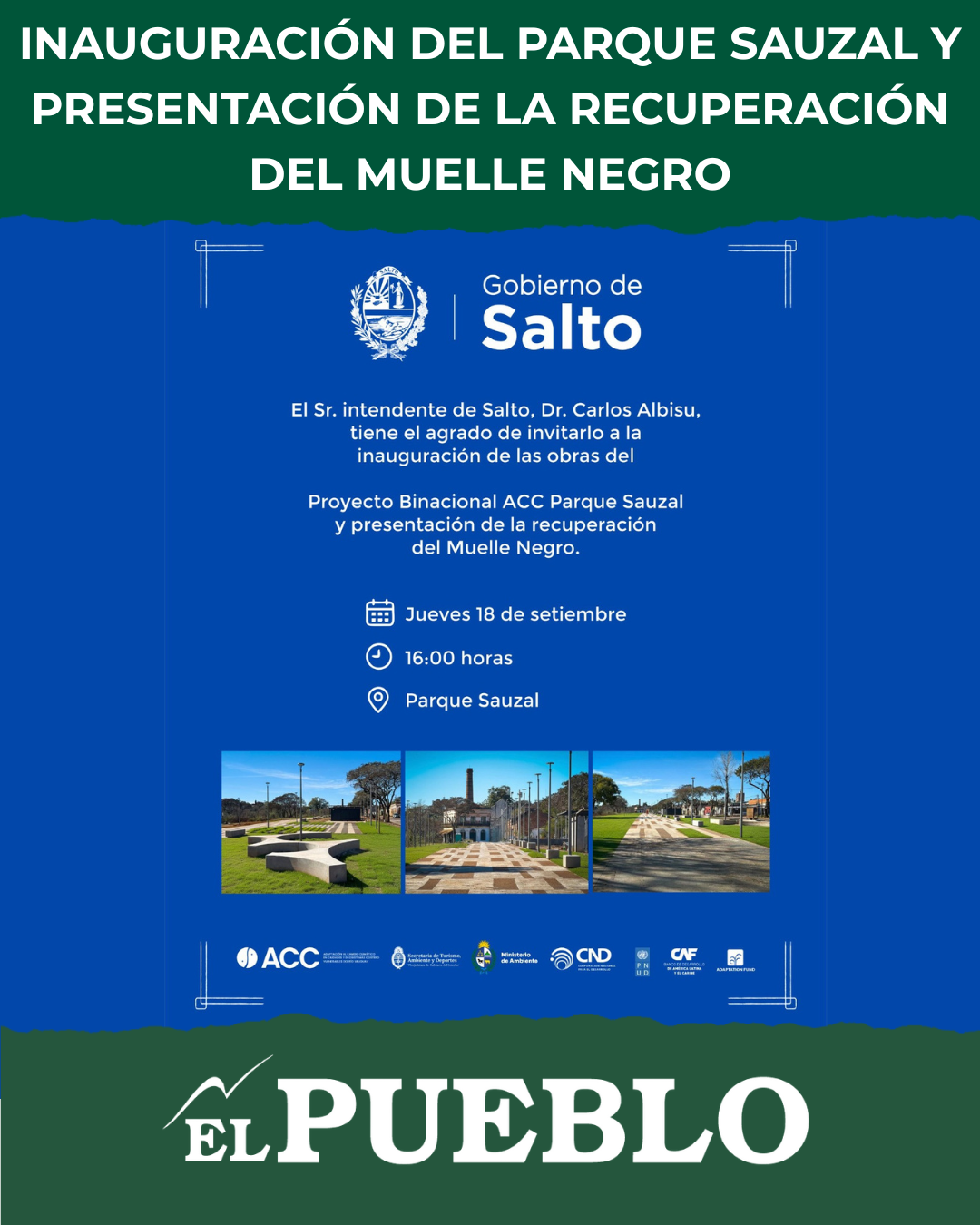 El próximo jueves 18 de septiembre a las 16:00 horas, el Gobierno de Salto inaugurará oficialmente el Parque Lineal Sauzal, en un acto que contará con la presencia del intendente Dr. Carlos Albisu, junto a autoridades nacionales y departamentales.