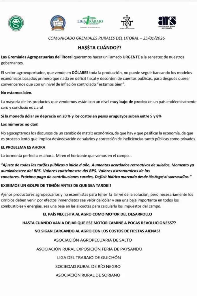 “¿Hasta cuándo?”, se titula el texto firmado por la Asociación Agropecuaria de Salto, la Asociación Rural Exposición Feria de Paysandú, la Liga del Trabajo de Guichón, la Sociedad Rural de Río Negro y la Asociación Rural de Soriano.