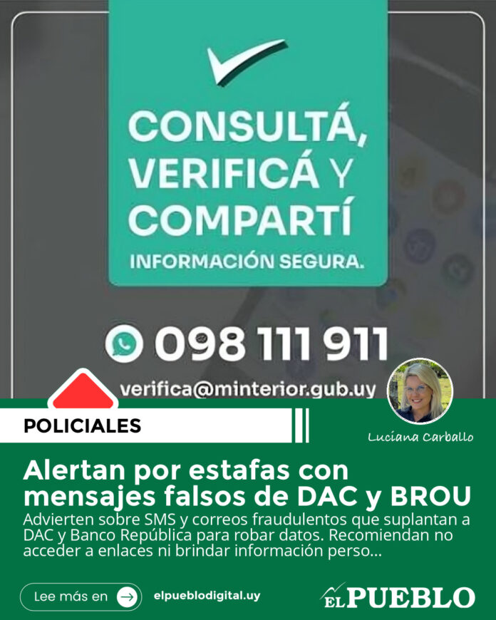 En las últimas horas, se emitió una advertencia ante la circulación de mensajes falsos utilizados para posibles estafas, en los que se suplanta la identidad de la empresa DAC y del Banco República. Según se informó, varios usuarios recibieron mensajes de texto (SMS) que aparentan ser enviados por la empresa DAC, en los que se solicita ingresar a un enlace y brindar información personal para recibir un supuesto envío. Desde la empresa aclararon que dichas comunicaciones no son oficiales ni tienen vínculo alguno con la institución.