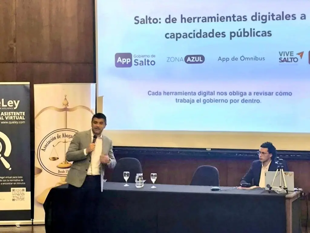 Durante la charla, Da Cunda compartió algunos de los procesos que se vienen impulsando desde el área de Innovación y Desarrollo del Gobierno de Salto, entre ellos la mejora de herramientas digitales, la app del Gobierno de Salto, los sistemas de reclamos ciudadanos, turnos, trámites, datos para la gestión y proyectos de modernización como Zona Azul.