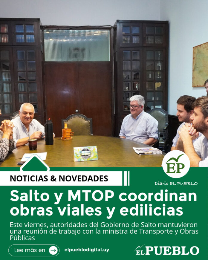 Este viernes, autoridades del Gobierno de Salto mantuvieron una reunión de trabajo con la ministra de Transporte y Obras Públicas, Lucía Etcheverry, y el director Nacional de Arquitectura, Martín Tierno. El encuentro, desarrollado en Juan Carlos Gómez 32, contó con la participación del secretario general, Cr. Walter Texeira Núñez; el director de Obras, Ing. Juan Manuel Texeira Núñez; el coordinador de la Oficina Técnica del Departamento de Obras, Arq. Federico Villar; y el coordinador general de Gestión Urbana, Sergio Acuña.