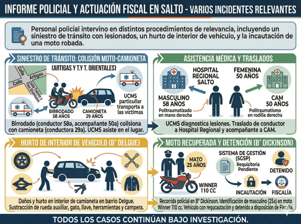 Al lugar asistió una unidad de emergencia de UCMS para atender a los ocupantes de la moto. El conductor fue diagnosticado con varios golpes en su mano derecha y trasladado al Hospital Salto, mientras que su acompañante sufrió lesiones en la rodilla derecha y fue derivada al Centro de Asistencia Médica (CAM).