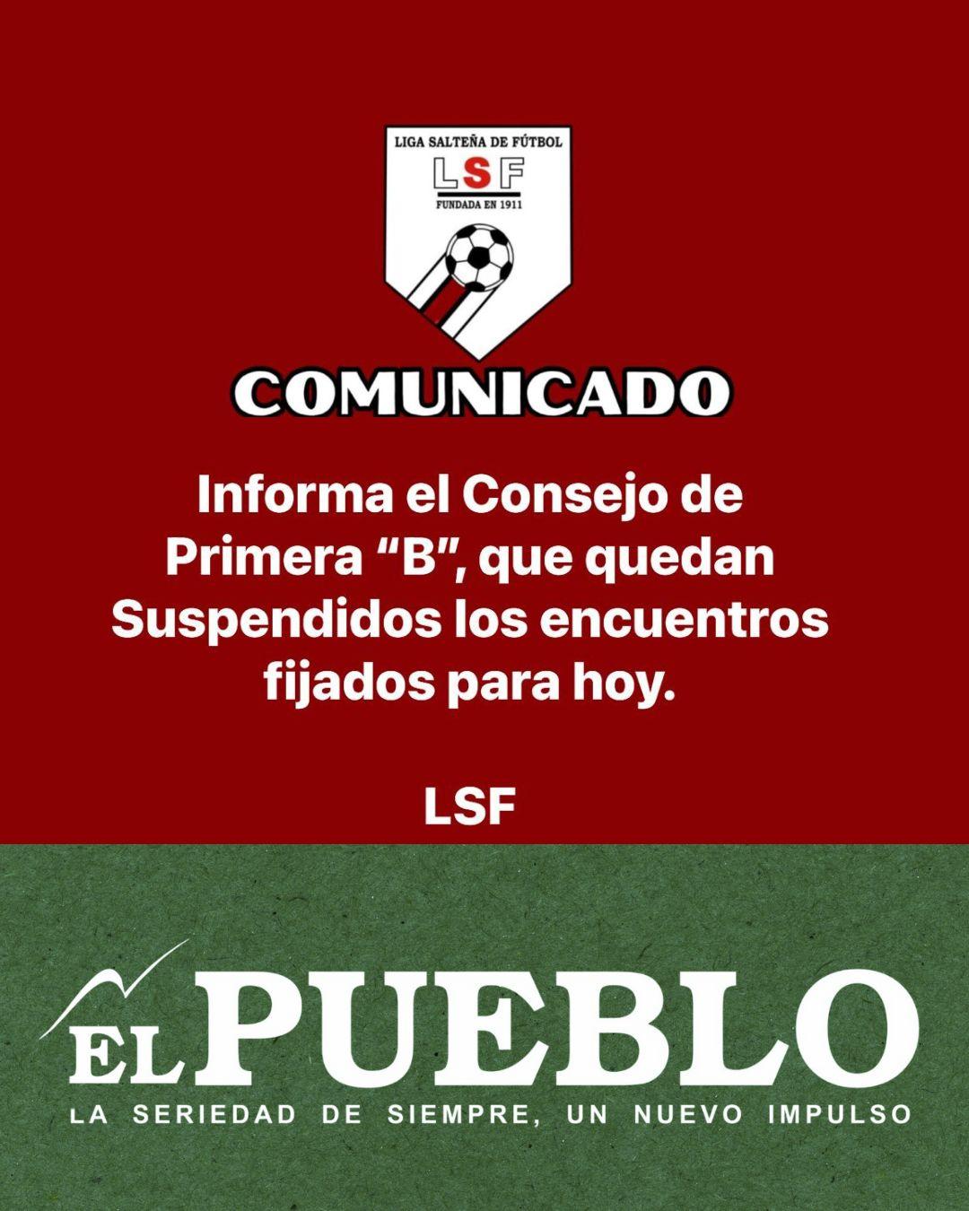 Sobre las 9.30′ de este sábado en la Divisional B, se determinó la segunda suspensión consecutiva. Las malas condiciones de los campos de juego, factor clave para postergar la última fecha de la segunda rueda. Ahora con rumbo al domingo 10 de agosto, en que también se iniciará el Campeonato Salteño de la Divisional A.