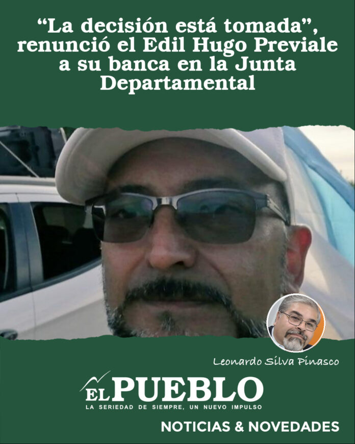 Una vez que se conoció en la tarde de ayer la decisión del Intendente Albisu de que sería el Edil Facundo Marziotte quien sucedería a Taruselli en la Dirección de Desarrollo Social, EL PUEBLO se enteró de la presentación de la renuncia a la Lista 50 del Partido Nacional y a su banca de Edil del Profesor Hugo Previale, la que será presentada formalmente en la sesión ordinaria de hoy en el legislativo local.