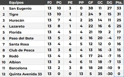 Santa Rosa 0 Albion 0. Tigre 3 Club de Pesca 0. San Eugenio 3 Florida 1.