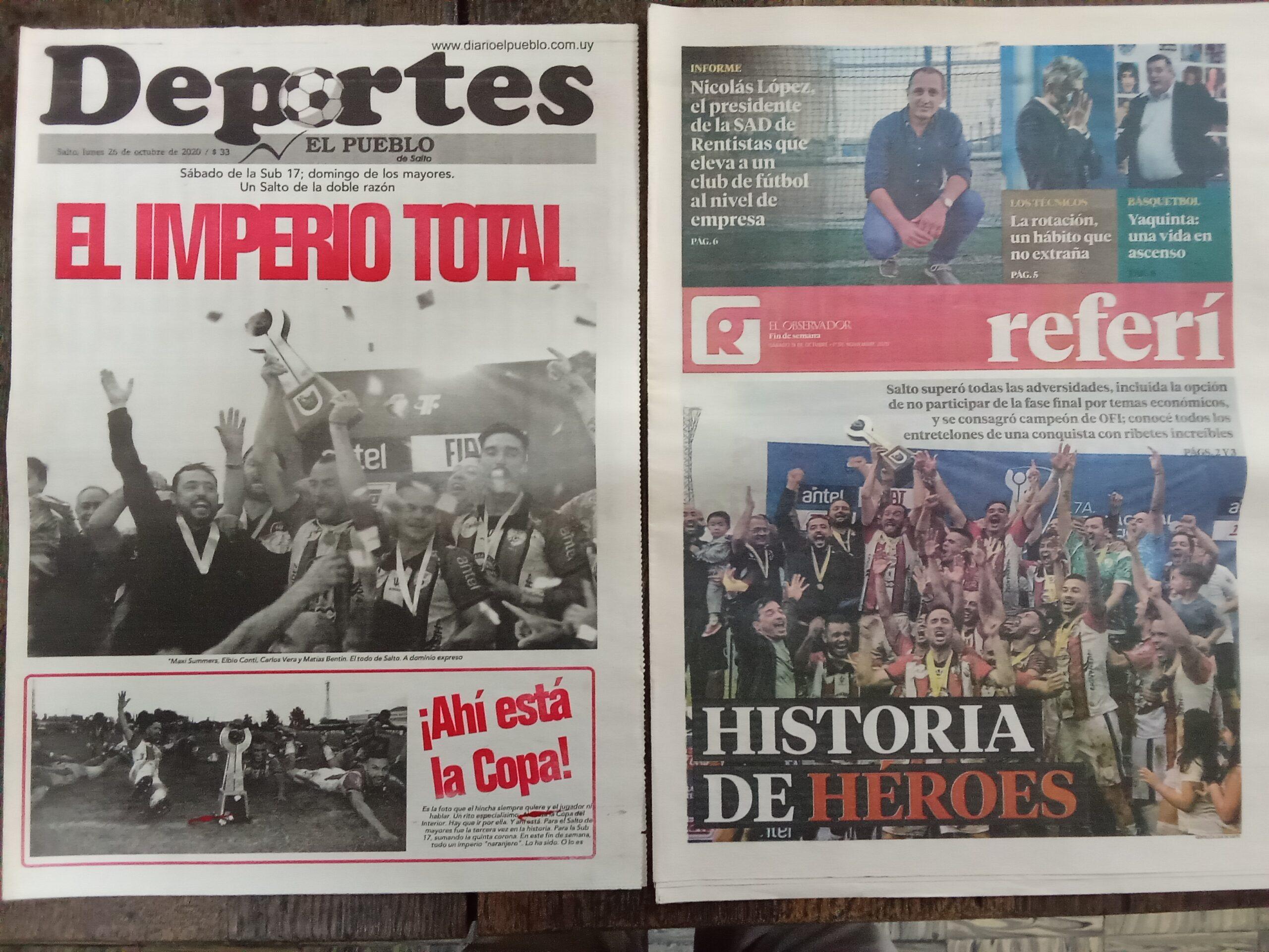 En el suplemento deportivo del lunes 26 de octubre de EL PUEBLO, esa portada, con una síntesis de tres palabras: EL IMPERIO TOTAL. Fue así. En un fin de semana, dos copas llegaron a las vitrinas de la Liga Salteña de Fútbol. Pero además, otros medios escritos se asociaron al pertinaz Salto de la gloria alcanzada. Diario «El Observador» de Montevideo, y en este caso con el inolvidable suplemento de aquellos tiempos líricos, «REFERÍ», no lo pensó dos veces para dar dimensión al excelso protagonismo del Salto gobernando en el Interior: HISTORIA DE HÉROES. Aparece la foto de ese Salto y de esa copa levantada en el Parque Dickinson, toda una síntesis del octubre que vuelve.