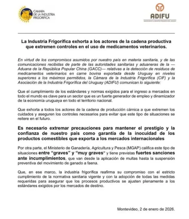 La Cámara de la Industria Frigorífica (CIF) y la Asociación de la Industria Frigorífica del Uruguay (ADIFU) emitieron una advertencia a todos los actores de la cadena cárnica tras recibir comunicaciones oficiales de las autoridades sanitarias y aduaneras de la República Popular China (GACC), en las que se informa sobre la detección de residuos de medicamentos veterinarios en carne bovina uruguaya exportada a ese país, por encima de los límites máximos permitidos.