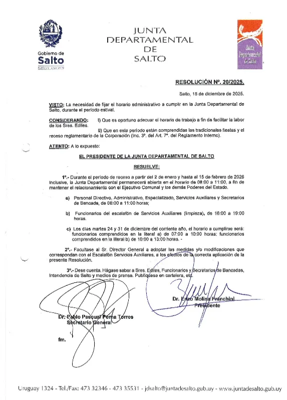La Junta Departamental de Salto informó que, a partir del 2 de enero y hasta el 15 de febrero de 2026 inclusive, entrará en vigencia el receso reglamentario de la Corporación, acompañado por un ajuste en los horarios administrativos debido al período estival.