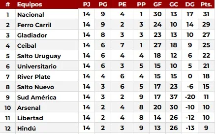 Pasó la cuarta fecha de la segunda rueda en la Divisional A, y, en el caso de Nacional, Ferro Carril, Gladiador, Ceibal y Salto Uruguay, los cinco primeros para ganar; y, en el caso de Universitario, el reparto de puntos frente a Sud América. En tanto, los resultados de la secuencia de la víspera determinaron que Nacional sea el primero en llegar a una base de 30 goles, el más efectivo de todos. Desde EL PUEBLO, una manera de repasar la clasificación general, sobre un total de 14 fechas disputadas.