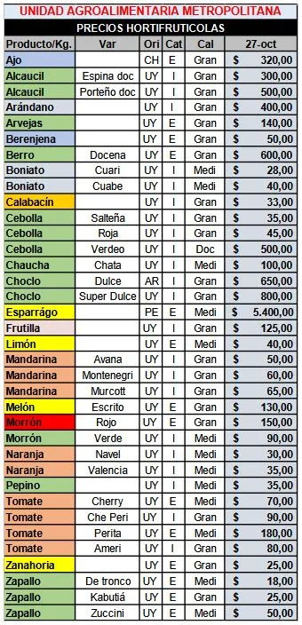 Lunes, 27 de Octubre del 2025: La semana comenzó con una menor afluencia de público comprador. Según informantes calificados mencionaron también un enlentecimiento en el levante de mercadería debido al pronóstico del descenso de temperatura y ocurrencia de precipitaciones para el resto de la semana, así mismo como la época del mes. Con respecto al último relevamiento de precios, se registraron descensos en los valores de tomates, morrón Verde, zapallito, chauchas, ajíes catalanes, habas, cebolla roja, albahaca, cebolla de Verdeo, perejil, mandarina Orri, durazno y melón. Por otro lado, se observaron aumentos en los precios de morrón Rojo, berenjena, arveja, calabacín, zapallo Kabutiá, espinaca y frutilla
