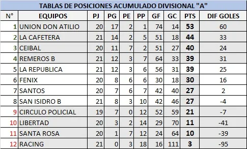 La nueva fecha que pasó en la Liga de Fútbol Súper Sénior. Ayer a mañana para jugarse y en la divisional «A», la nueva imposición del puntero Unión Don Atilio, observando una ventaja de nueve puntos en relación al escolta y esos 74 goles a favor que también impacta.