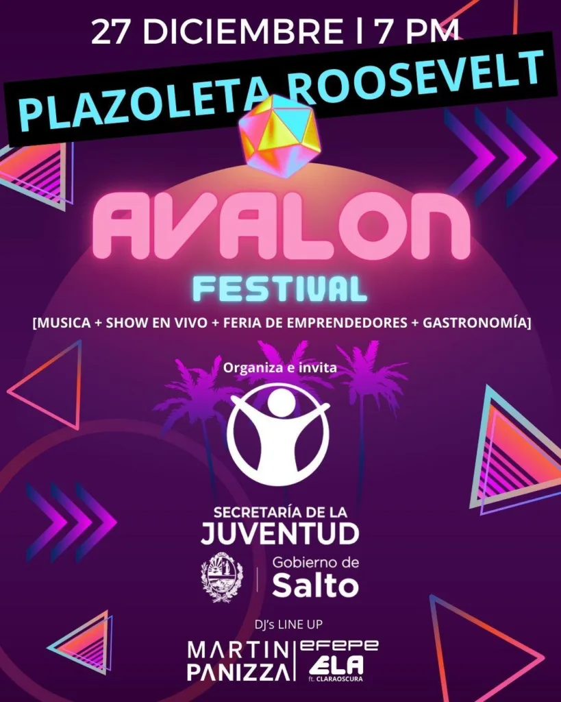 La Secretaría de la Juventud del Gobierno de Salto invita a la población a participar de Avalon Festival, una propuesta cultural y recreativa que se realizará este sábado 27 de diciembre, a partir de las 19:00 horas, en la Plazoleta Roosevelt.