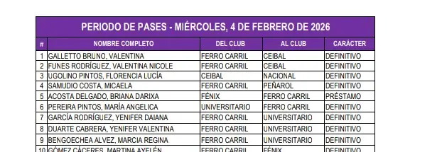 Para el fútbol Femenino, fue ayer miércoles el último día para la solicitud de pases. Un total de 10 al tiempo de pasar de un equipo a otro. De las 10, un total de 6 desde Ferro Carril a Ceibal, Peñarol y Universitario. La mayoría en carácter de definitivos. Se trata de pasar revista en todos los casos..