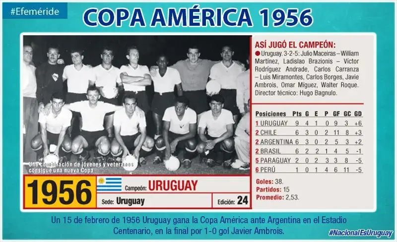 Un 15 de febrero de 1956, Uruguay conquistaba en Montevideo una nueva Copa América.