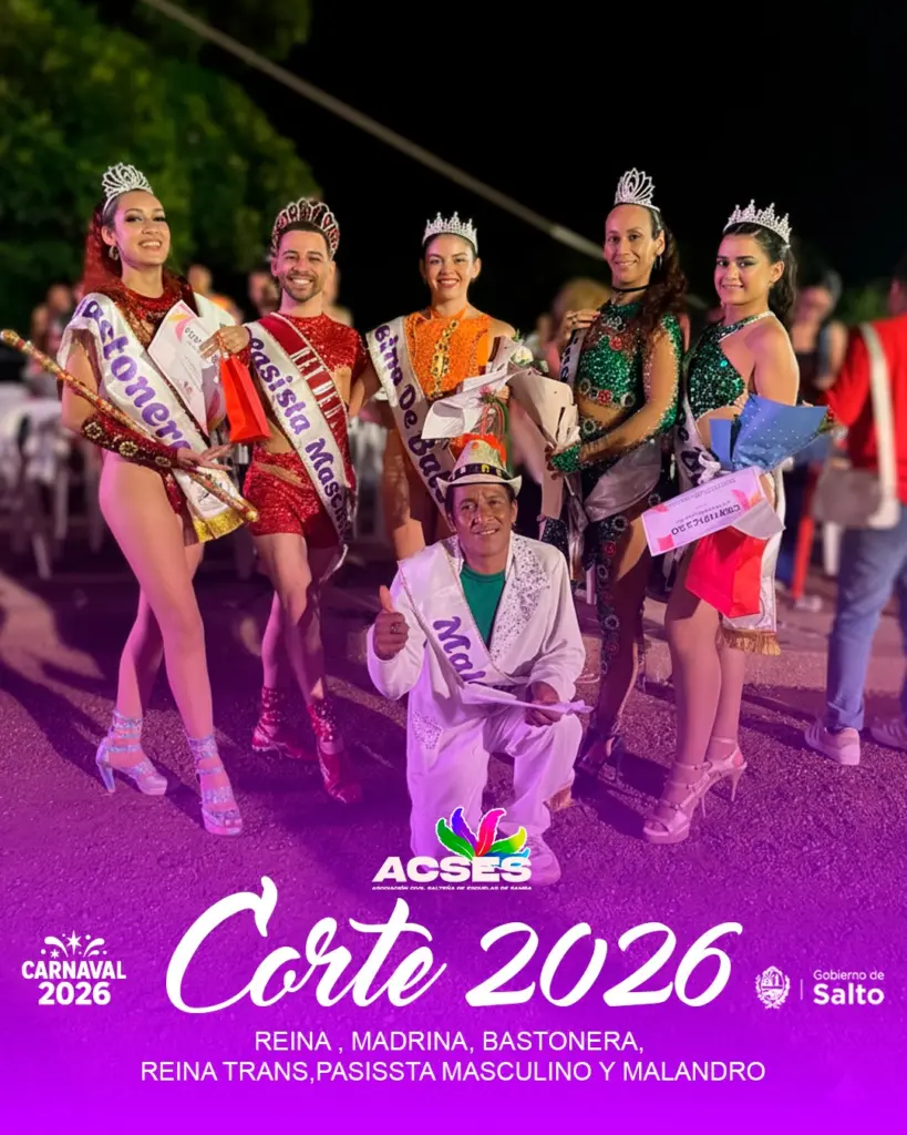 La fiesta incluyó además la elección de la Corte del Carnaval, tarea que estuvo a cargo de un jurado especialmente convocado por ACSES. Como Reina de Batería fue elegida Tamara Lima, representante de la escuela La Estrella; Madrina de Batería, Sharon Peralta de Mulambé; Bastonera, Valentina Silgoria de Unidos de la Zona Sur; Reina Trans 2026, Daniela Benítez de Barrio Ceibal; Pasista Masculino, Bruno Scaraffoni, también de Barrio Ceibal; y Malandro, Francisco González de Belleza Real.