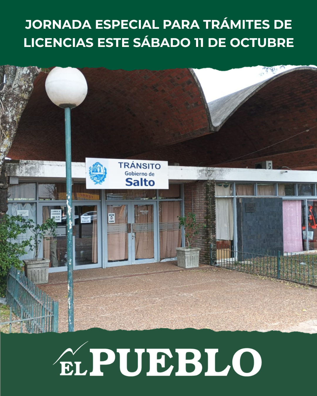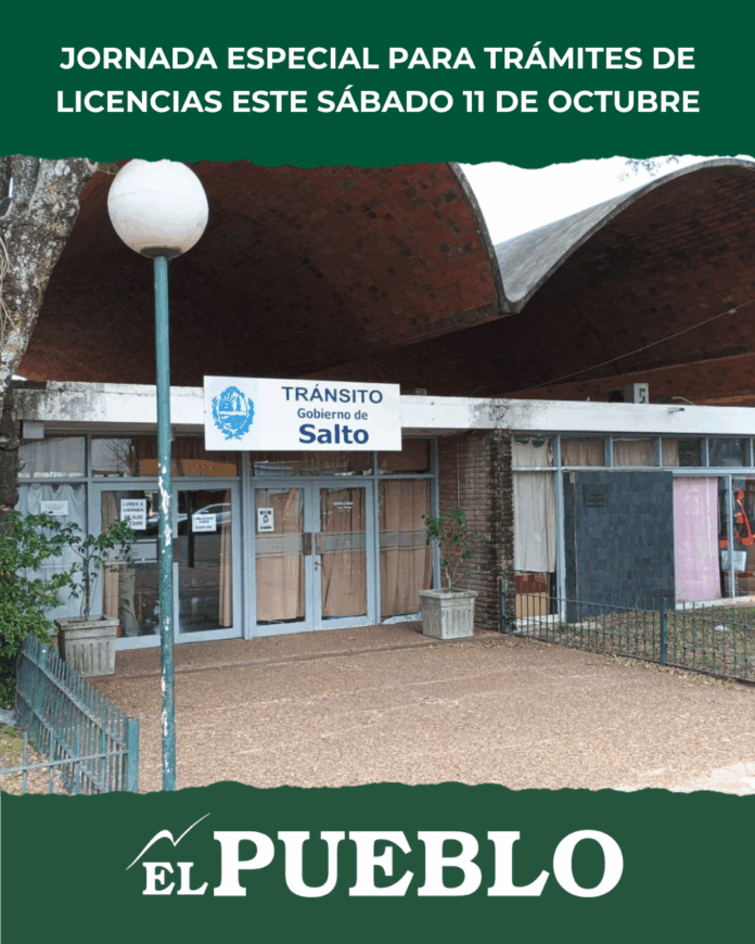 El Departamento de Movilidad Urbana de la Intendencia de Salto informó que el sábado 11 de octubre, en el horario de 7:00 a 13:00, se realizará una jornada especial para la tramitación y renovación de licencias de conducir.