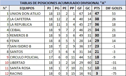 Pasó la nueva fecha en el fútbol de la Liga Súper Senior, para que Unión Don Atilio prolongue su condición de líder exclusivo en la Divisional «A». Como consecuencia de los últimos resultados, solo queda admitir que tiene todo lo que hay que tener. Es el de mayor número de victorias, es el que menos partidos perdió, se convierte en el equipo más efectivo y con La Cafetera el menos goleado. Al fin de cuentas, dueño de toda la estadística. En el polo opuesto de la tabla aparece Racing, de merma notoria en relación a las últimas temporadas. Los albiverdes son los únicos que permanecen sin ganar. La clasificación es indicativa, en todos los casos.