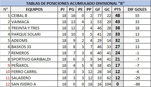 En la Divisional «B» de la Liga Súper Sénior, la punta a manos de Ceibal, estableciendo una ventaja de cinco puntos en relación al segundo. No otro que Vaimaca y sus 43 puntos, mientras Treinta y Tres registra 38 puntos. A Ceibal tampoco le falta gol, desde el momento que llega a 77. Lo de Adeoms es como para tenerlo en cuenta: con 14 goles es el arco menos vencido al cabo de las 18 fechas disputadas. Hay que tener en cuenta esta tabla.