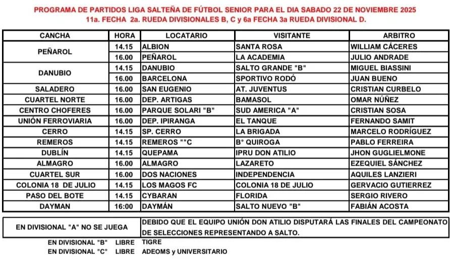 Segunda rueda en todas las divisionales que conforman la Liga de Fútbol Sénior, a excepción hecha de la divisional «A», teniendo en cuenta que Unión Don Atilio encara las etapas finales del Campeonato de selecciones, representando a Salto. La B, C y D levantan el telón. Las definiciones que van llegando y la consigna ineludible de vencer. En todas las canchas de la Liga, estos partidos que se juegan y con los árbitros centrales designados.
