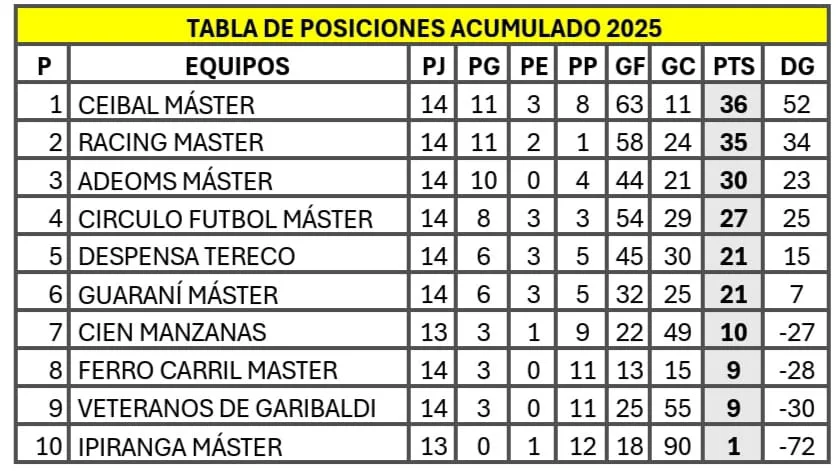 líder de Ceibal, mientras Racing con un solo punto por debajo. Es el Acumulado 2025,