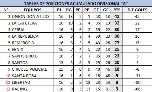 Para Unión Don Atilio, los 41 puntos, observando 9 unidades más que el más cercano perseguidor.