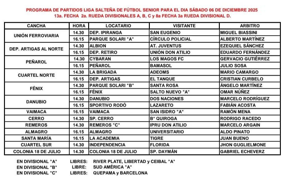 Igualmente es sábado de acción para la Liga de Fútbol Sénior, con un total de 19 partidos enmarcados. Las divisionales que van afrontando tiempos de resolución. El detalle general es para tenerlo en cuenta.