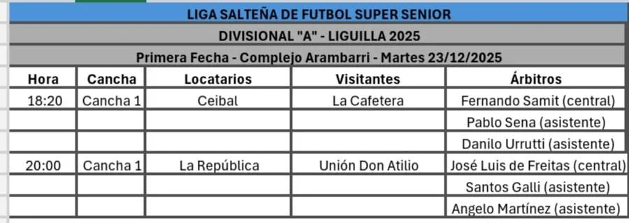 No solo en la Liga Salteña de Fútbol la urgencia por finalizar el Campeonato antes del 31 de diciembre. También surge en la misma dirección la Liga Súper Sénior. El pasado domingo no se pudo iniciar la liguilla en su primera fecha a nivel de la Divisional “A”. Por eso ayer se pactó para hoy. Todos contra reloj. Una manifestación de verdad inapelable.