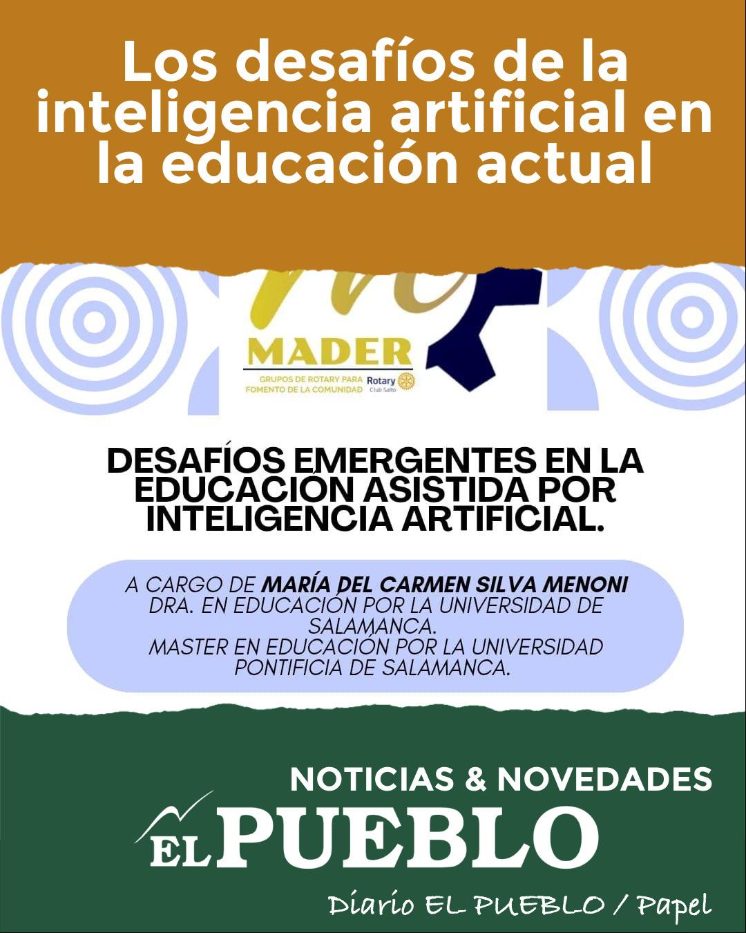 El Rotary Club Salto, a través de MADER – Grupos de Rotary para el fomento de la comunidad, invita a la conferencia “Desafíos emergentes en la educación asistida por inteligencia artificial”, a cargo de María del Carmen Silva Menoni, doctora en Educación por la Universidad de Salamanca y máster en Educación por la Universidad Pontificia de Salamanca.