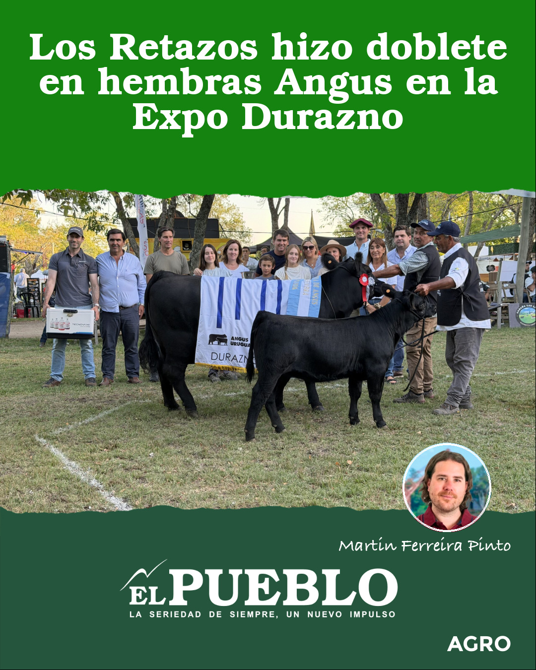 La jura de hembras Angus en la Expo Durazno dejó una definición que no suele suceder: la Gran Campeona y la Reservada Gran Campeona fueron para la cabaña Los Retazos, de Héctor Mario Eugui, del departamento de Soriano, en una pista que, según la jurado María Mattos, combinó volumen, calidad y equilibrio racial.