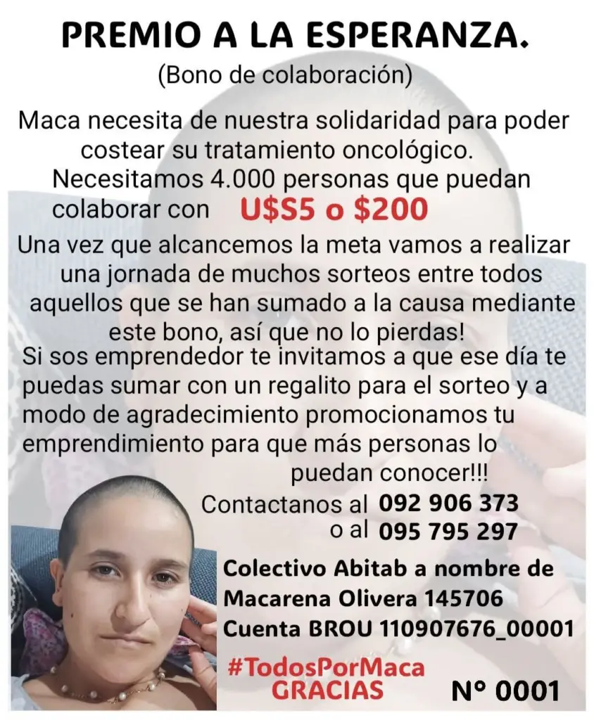 Macarena dejó su trabajo como repostera hace un año debido al avance de la enfermedad. Hoy, su esposo —empleado de la Intendencia— es el único sostén económico del hogar, mientras ella transita tratamientos que ya no están dando los resultados esperados. La quimioterapia dejó de funcionar y la alternativa quirúrgica implica un riesgo demasiado alto. Frente a ese escenario, los médicos le plantearon una última posibilidad: un procedimiento altamente especializado que solo se realiza en Brasil o en Estados Unidos. Por su costo, la opción brasileña es la única viable, aunque aun así el monto resulta inalcanzable para una familia trabajadora.