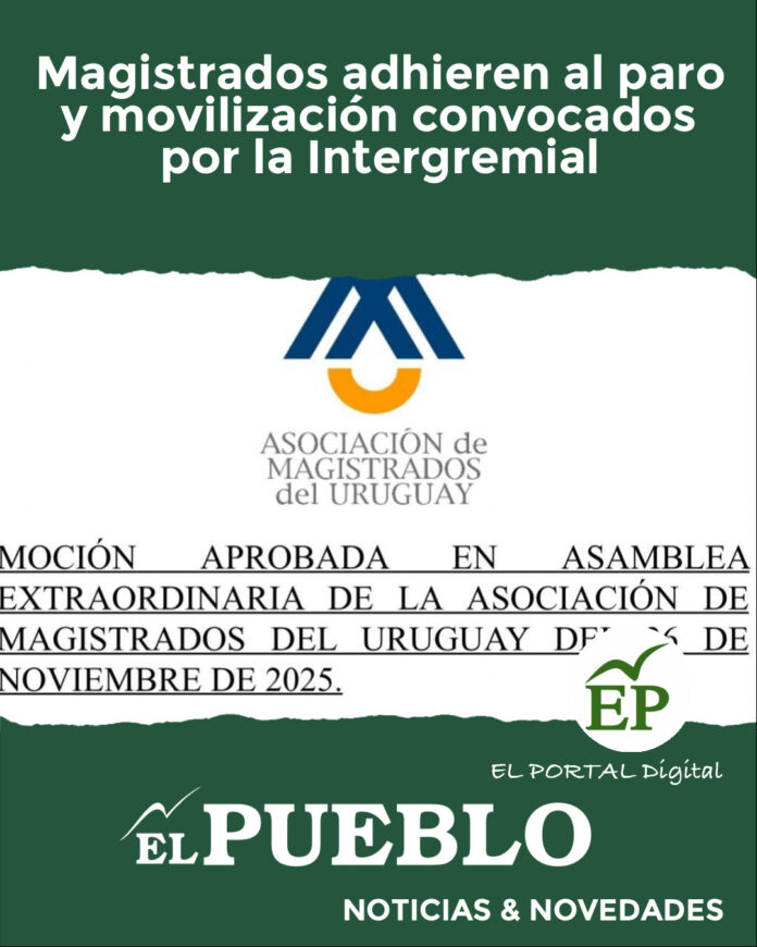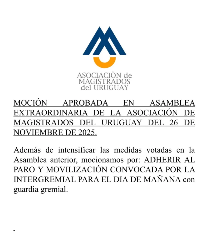 La Asociación de Magistrados del Uruguay aprobó este miércoles una nueva moción durante una Asamblea Extraordinaria celebrada el 26 de noviembre de 2025. El gremio resolvió intensificar las medidas que ya habían sido votadas en la instancia anterior y, además, decidió adherir al paro y movilización convocados por la Intergremial para mañana, en defensa de sus reivindicaciones.