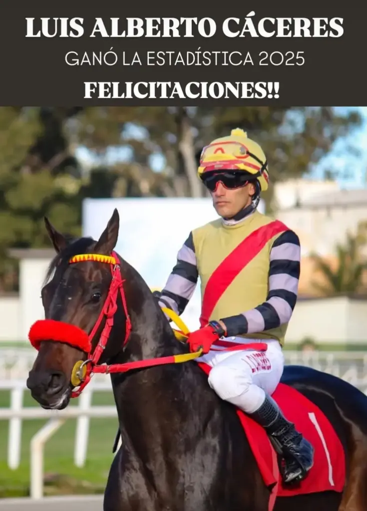 El salteño protagonizó una definición apasionante el pasado sábado, donde logró tres victorias en la jornada, resultado clave para despegarse definitivamente en la tabla anual. Esa cosecha le permitió sacar una ventaja imposible de descontar para su inmediato perseguidor y asegurarse, una vez más, el premio mayor. Nacido en Campo de Todos, Cáceres continúa escribiendo páginas doradas en la historia del turf nacional, imponiéndose en una competencia cada vez más exigente, donde participan jockeys de primer nivel, muchos de ellos provenientes de Brasil, que llegan a Maroñas en busca de protagonismo. Las tres carreras ganadas el sábado fueron el reflejo de una campaña sólida, regular y contundente. Un triunfo implacable que confirma por qué Cáceres es considerado el mejor jockey del país en la actualidad. Un salteño que festeja en la capital, que sigue cruzando el disco antes que nadie y que, temporada tras temporada, continúa haciendo historia en el turf más importante del Uruguay. Los años dónde Cáceres ganó las estadísticas; 2013, 2015, 2016, 2017 y 2025.