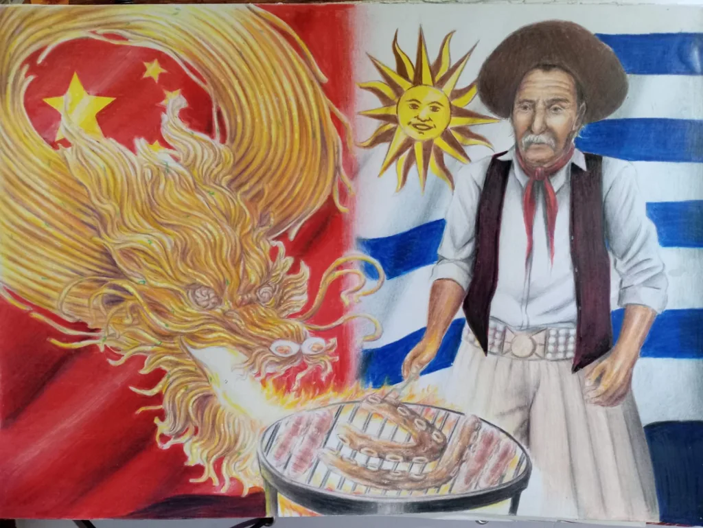 El dibujo representa el encuentro simbólico y la unión entre dos culturas, la uruguaya y la China. Por un lado, el gaucho haciendo el asado representa a Uruguay. Y por el otro, el gigante dragón chino encendiendo con su aliento de fuego la parrilla, ambos ayudándose mutuamente. Para el uruguayo el asado es más que carne al fuego, es unión y tradición, un momento de encuentro entre seres queridos para disfrutar.