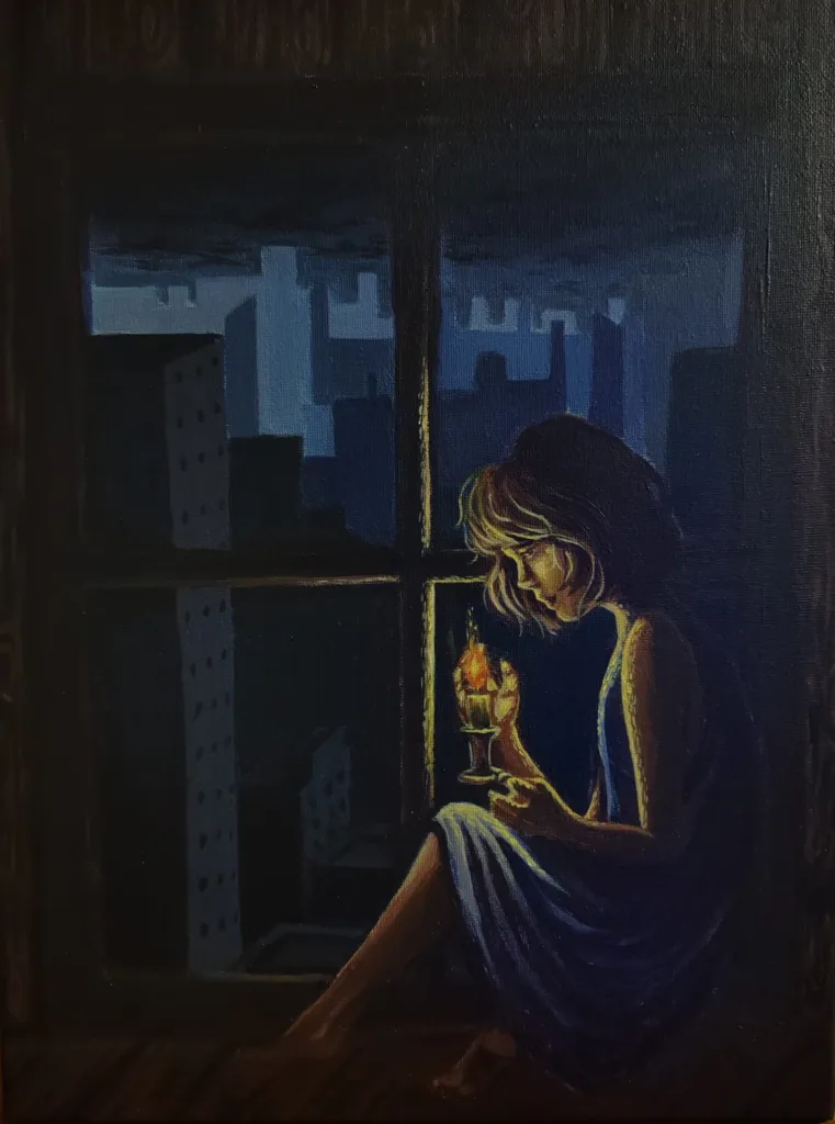 Esta obra representa el contraste de una sociedad inundada por las tinieblas, y una llama que perdura encendida en búsqueda de un cambio. Con la esperanza de que la violencia, la desigualdad y la discriminación que existe allá afuera no afecte a su luz interior, luchando día con día para que no se apague… Ser la luz en medio de la oscuridad.